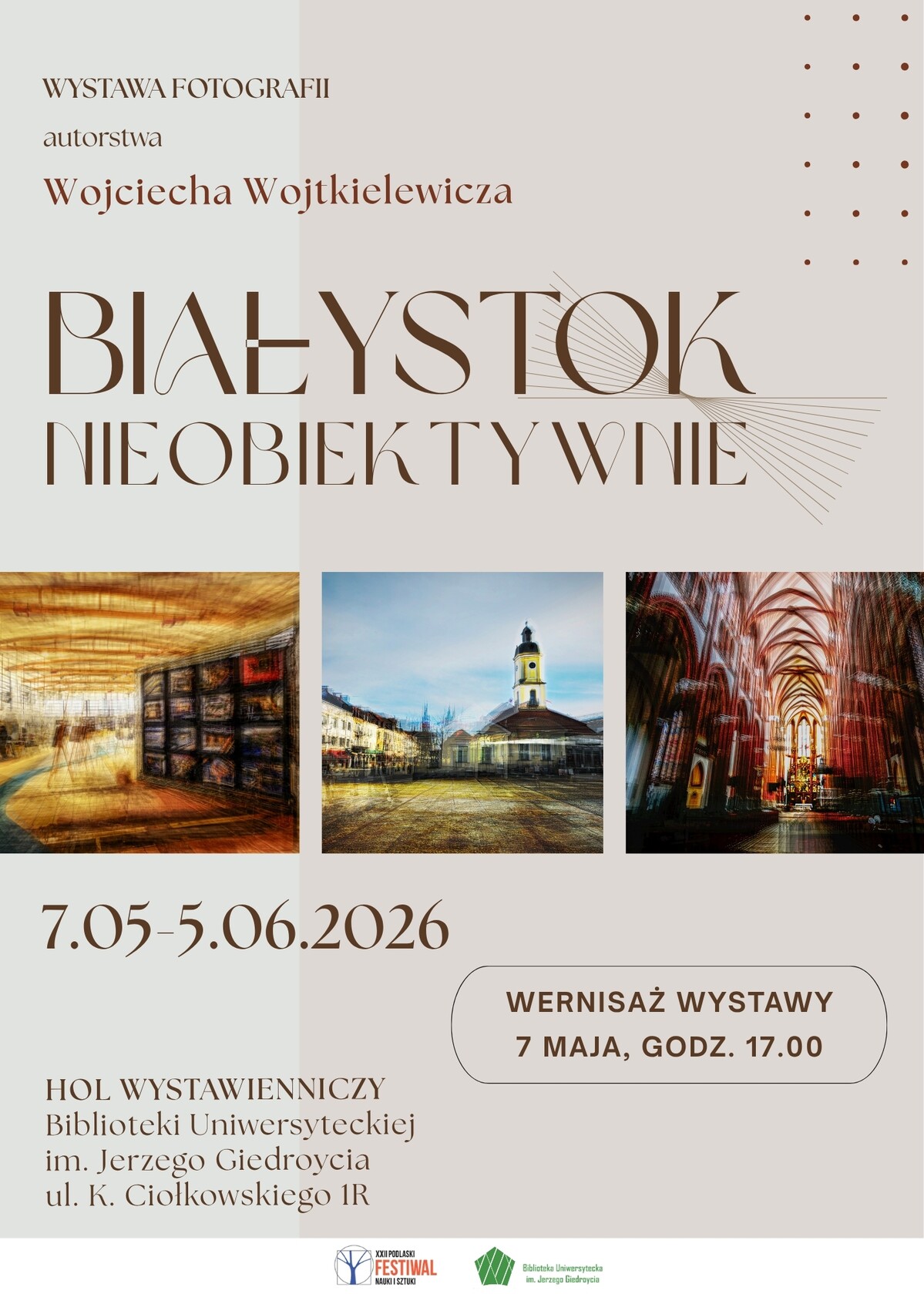 Biblioteka Uniwersytecka w Białymstoku zaprasza na wernisaż wystawy fotografii Wojciecha Wojtkielewicza pt. „Białystok nieobiektywnie”, który odbędzie się 7 maja br., o godzinie 17:00 w holu wystawienniczym Biblioteki Głównej przy ul. Ciołkowskiego 1R. Na prezentowanych zdjęciach w niemal malarski – i oczywiście nieoczywisty – sposób ukazane są białostockie miejsca i budynki.