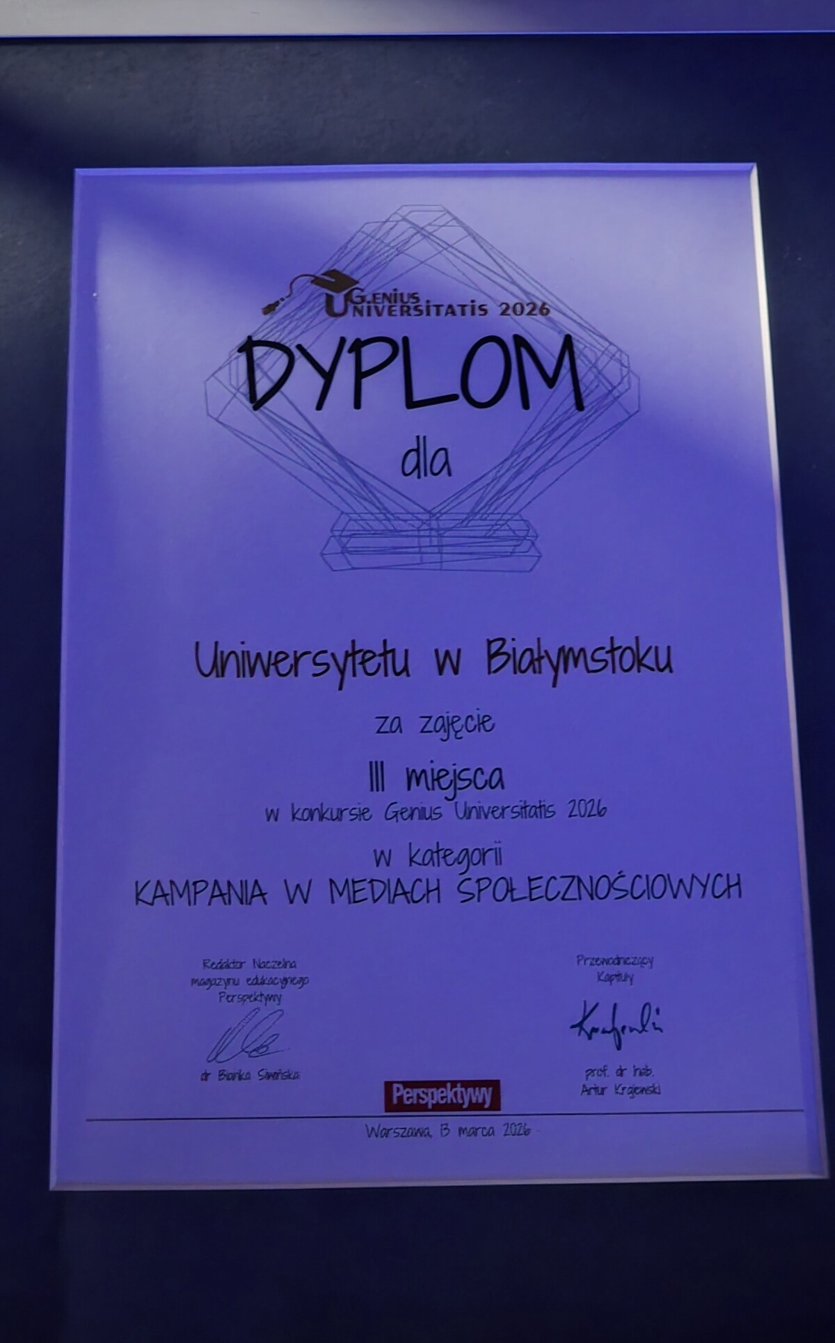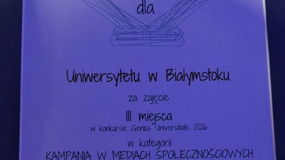Uniwersytet w Białymstoku zajął 3. miejsce w konkursie Perspektywy Genius Universitatis 2026 w kategorii kampania w mediach społecznościowych. Uroczysta gala odbyła się w piątek 13 marca br. w Centrum EXPO XXI Warszawie. UwB reprezentowały prorektor uczelni ds. studentów i doktorantów dr hab. Anna Gardocka-Dubatówka, prof. UwB i Magda Zaręba pełnomocnik rektora ds. koordynacji promocji wydziałów i innych jednostek Uczelni.