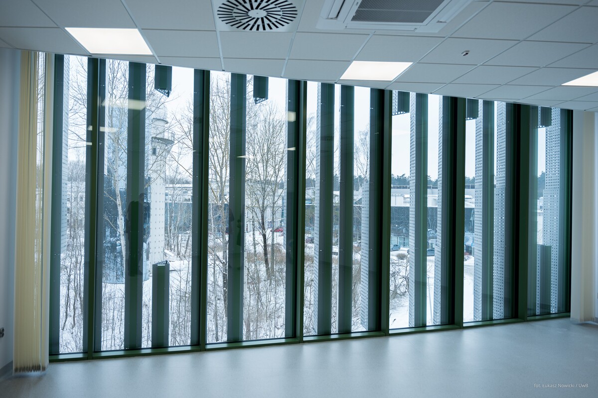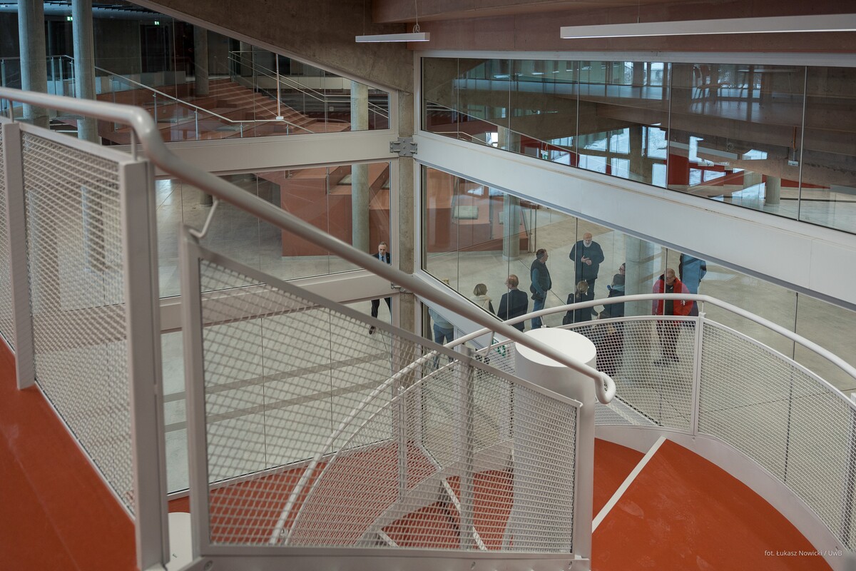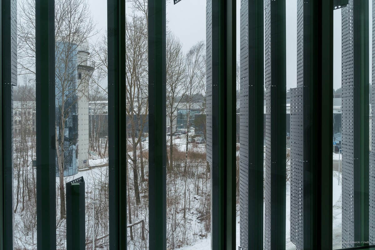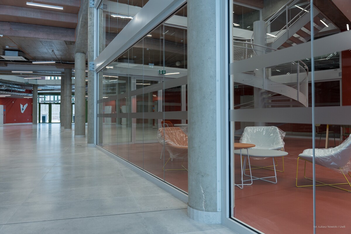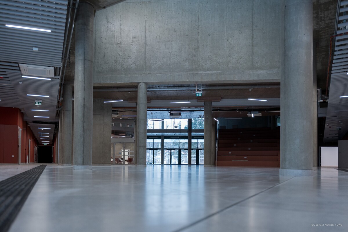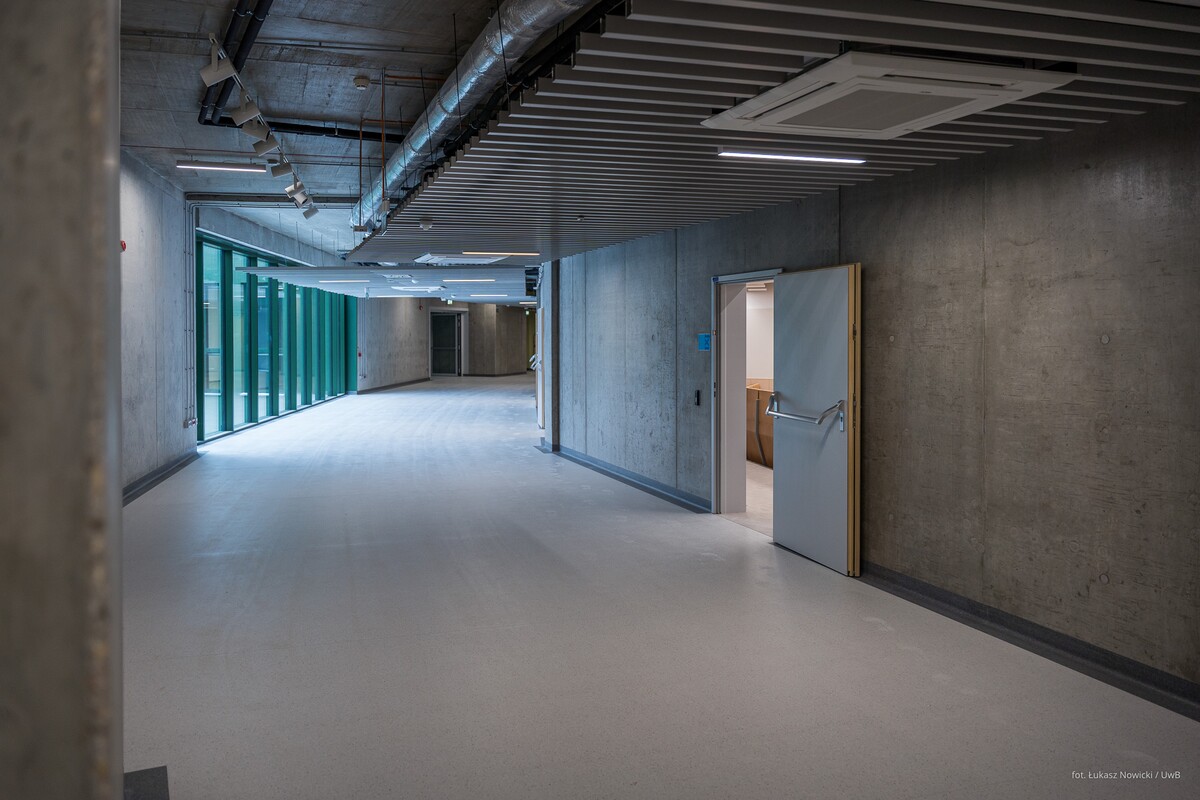 Na poziomie I piętra obiekt jest połączony nadziemną zabudowaną kładką z położoną obok Biblioteką Uniwersytecką – o czym wspomniał w trakcie konferencji dr hab. Marek Kochanowski, prof. UwB dyrektor Biblioteki Uniwersyteckiej im. Jerzego Giedroycia.
