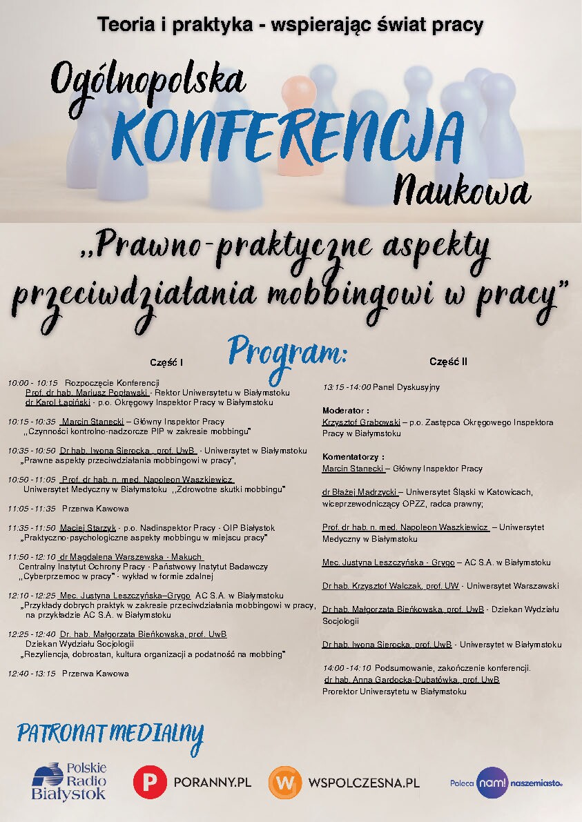 Uniwersytet w Białymstoku wraz z Okręgowym Inspektoratem Pracy w Białymstoku współorganizują konferencję poświęconą jednemu z najpoważniejszych wyzwań współczesnego rynku pracy – zjawisku mobbingu. Odbędzie się ona 21 października 2025 r. w siedzibie Wydziałów Matematyki i Informatyki UwB (kampus, ul. Ciołkowskiego). początek o godz. 10.