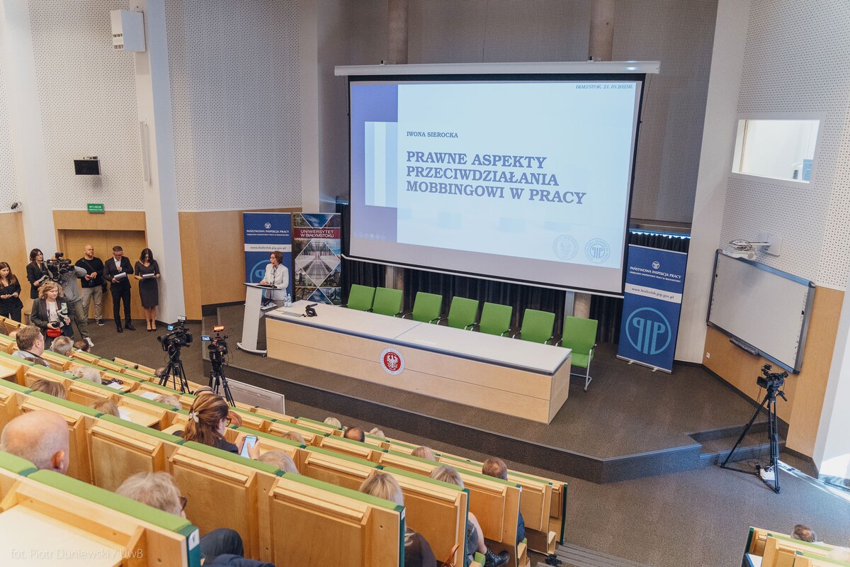 O tym, czym jest mobbing, o zdrowotnych skutkach tego zjawiska, o prawnych aspektach przeciwdziałania mobbingowi w pracy, a także o przykładach dobrych praktyk dyskutowali uczestnicy ogólnopolskiej konferencji naukowej pt. Prawno-praktyczne aspekty przeciwdziałania mobbingowi w pracy. Wydarzenie odbyło się 21 października 2025 r. na Uniwersytecie w Białymstoku, a zorganizowali je największa podlaska uczelnia wraz z Okręgowym Inspektoratem Pracy w Białymstoku.