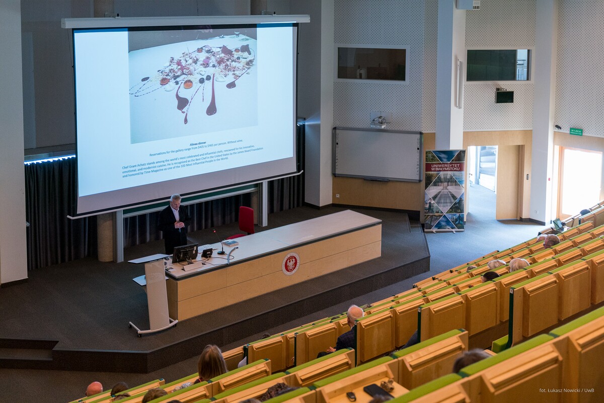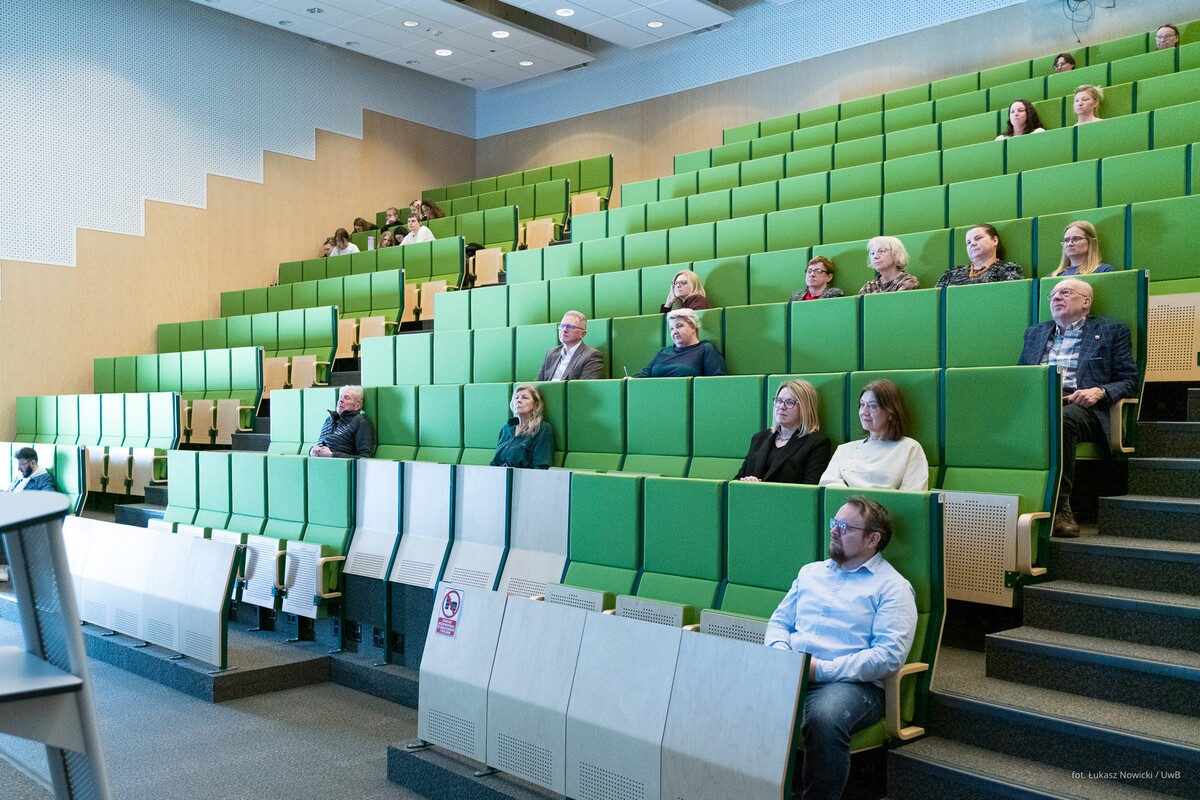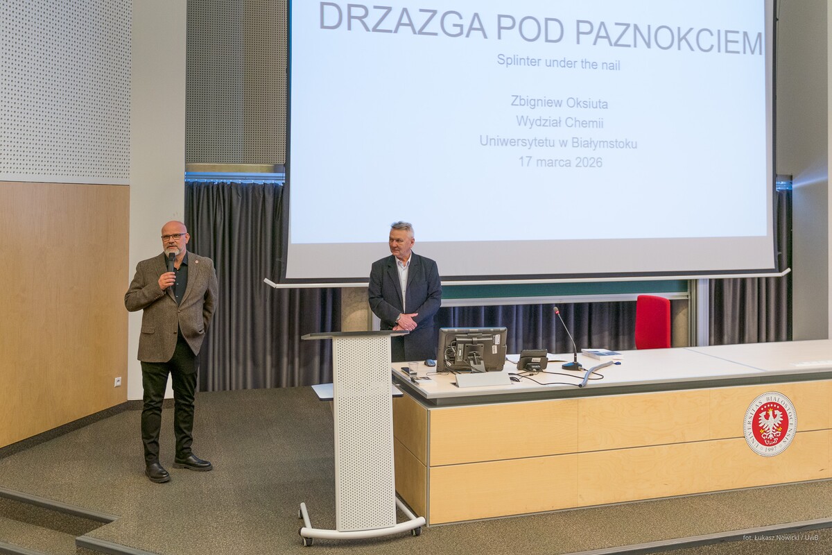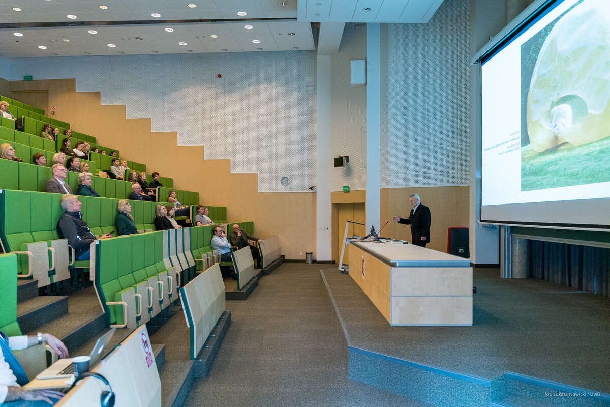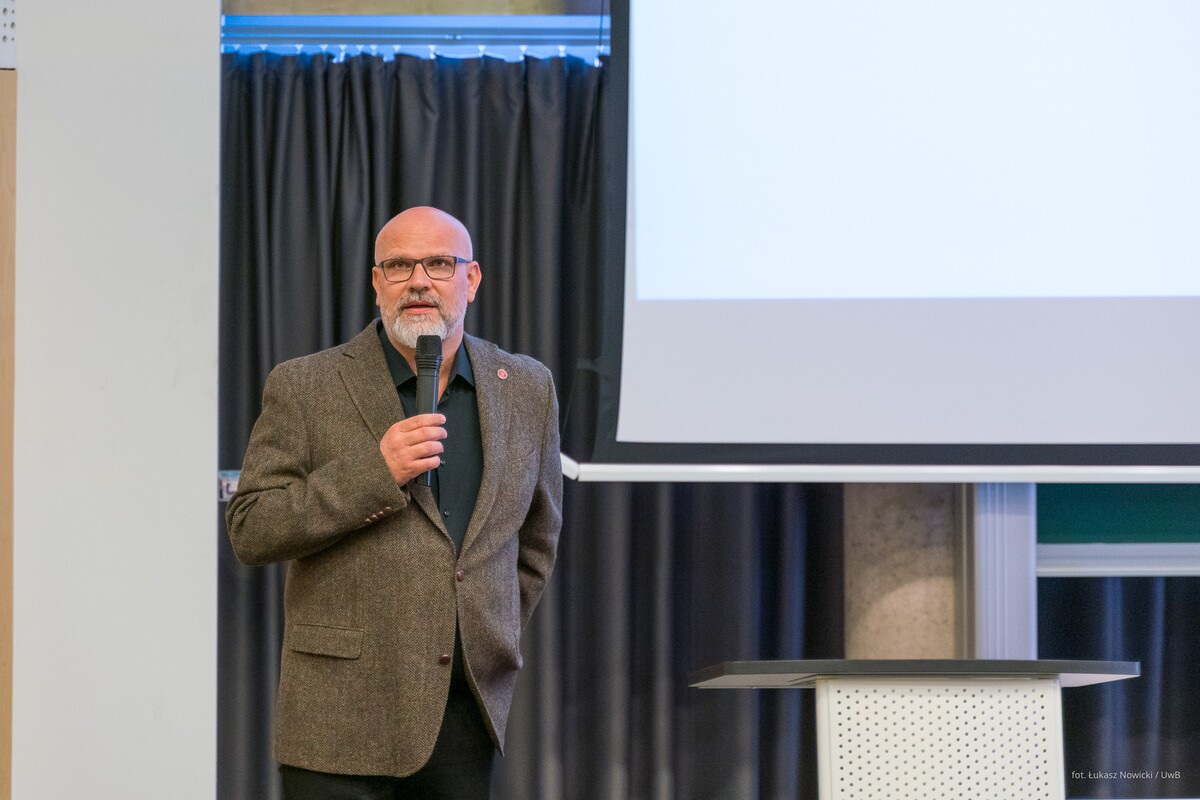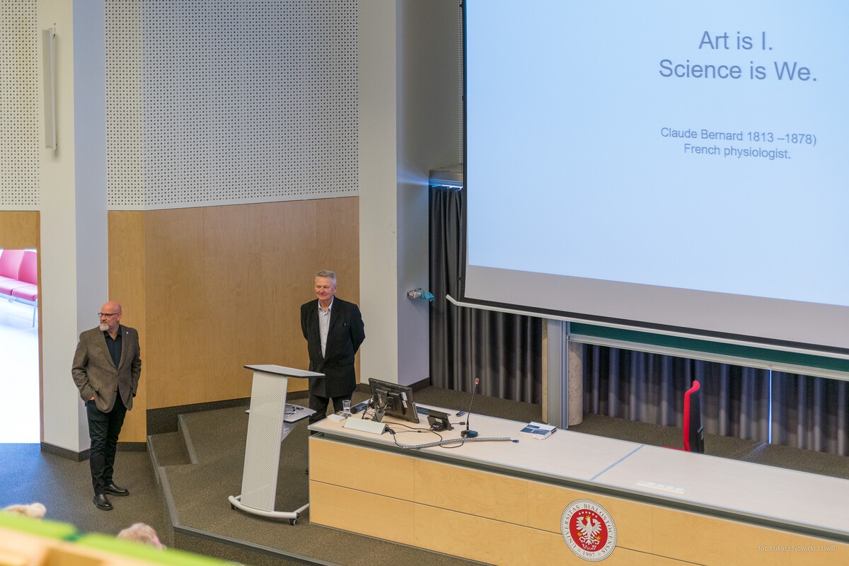 Gościa oficjalnie przywitał prorektor uczelni ds. rozwoju dr hab. Tomasz Bajkowski, prof. UwB, który wspomniał, że na największej podlaskiej uczelni – właśnie dzięki Zbigniewowi Oksiucie - może powstać interdyscyplinarne Laboratorium, łączące sztukę i architekturę z myślą biologiczną, chemiczną, filozoficzną, edukacyjną.