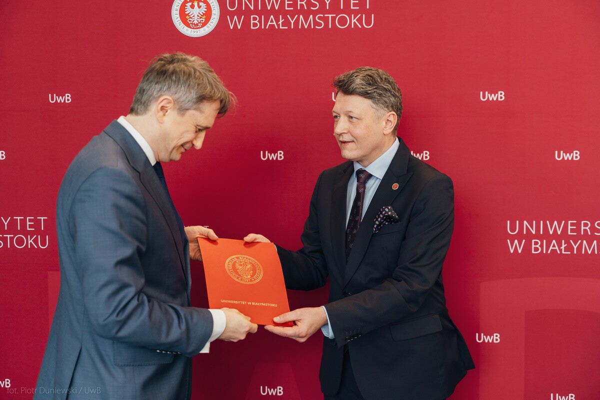 Za osiągnięcia naukowe i otrzymanie tytułu profesora, a także za zaangażowanie w rozwój uczelni i pozyskanie ważnych grantów naukowych rektor Uniwersytetu w Białymstoku prof. dr hab. Mariusz Popławski uhonorował prof. dr. hab. Karola Łopateckiego – badacza z Wydziału Stosunków Międzynarodowych UwB. Uroczystość odbyła się 18 lutego 2026 r. podczas posiedzenia Senatu Uczelni.