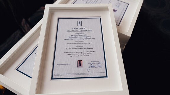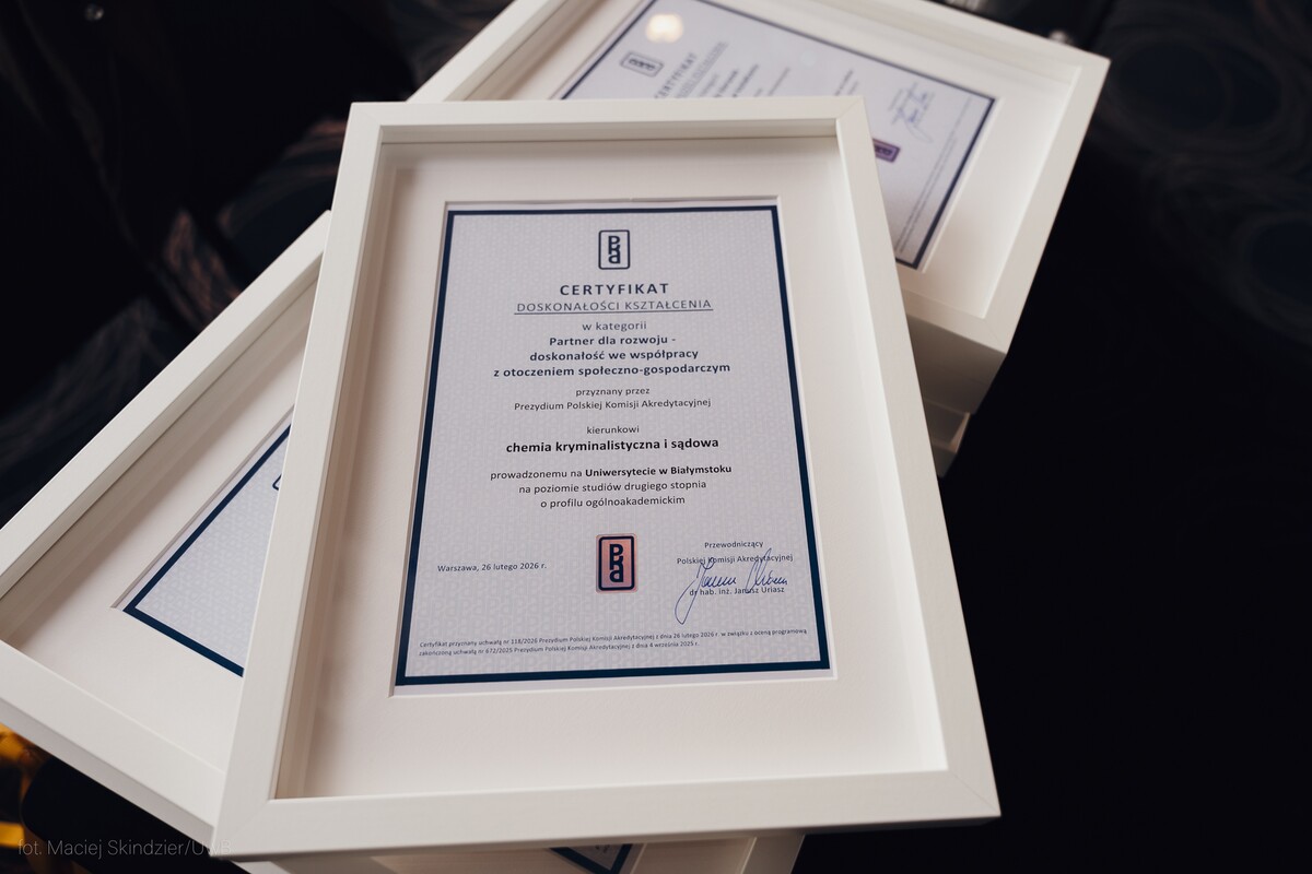 Kierunek chemia kryminalistyczna i sądowa realizowany jest na studiach stacjonarnych II stopnia na Wydziale Chemii UwB. Certyfikat Doskonałości Kształcenia Polskiej Komisji Akredytacyjnej został przyznany w kategorii Partner dla rozwoju − doskonałość we współpracy z otoczeniem społeczno-gospodarczym.