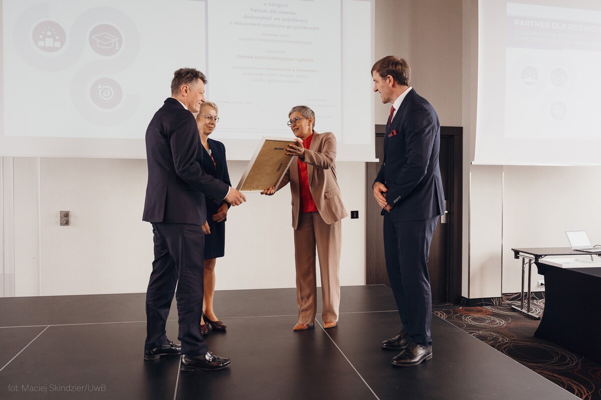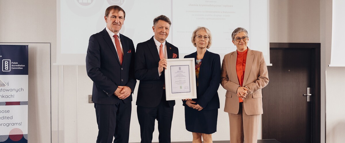 To wielki sukces Wydziału Chemii i całej uczelni. Rektor Uniwersytetu w Białymstoku prof. dr hab. Mariusz Popławski i dziekan Wydziału prof. dr hab. Joanna Karpińska oficjalnie odebrali Certyfikat Doskonałości Kształcenia PKA dla kierunku chemia kryminalistyczna i sądowa. Uroczystość odbyła się 25 marca br. w Warszawie. Dzień później władze uczelni i wydziału oraz zaproszeni goście spotkali się w kampusie UwB.