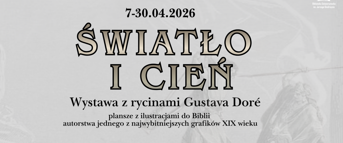 W dniach od 7 do 30 kwietnia 2026 r. w przestrzeni Biblioteki Uniwersyteckiej im. Jerzego Giedroycia gościć będzie wystawa pt. „Światło i cień”, prezentująca 11 plansz z rycinami Gustava Doré, jednego z najwybitniejszych ilustratorów XIX wieku.