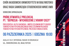 Chór Akademicki Uniwersytetu w Białymstoku oraz Rada Samorządu Studenckiego Wydziału Nauk o Edukacji UwB serdecznie zapraszają na wyjątkowe wydarzenie w ramach Światowego Dnia Zdrowia Psychicznego. To próba otwarta z prelekcją pt. „Depresja – wychodzenie z krainy ciszy”, która odbędzie się 6 października, o godz. 19 w siedzibie Wydziału Nauk o Edukacji UwB przy ul. Świerkowej 20. Wydarzenie jest otwarte dla wszystkich zainteresowanych.