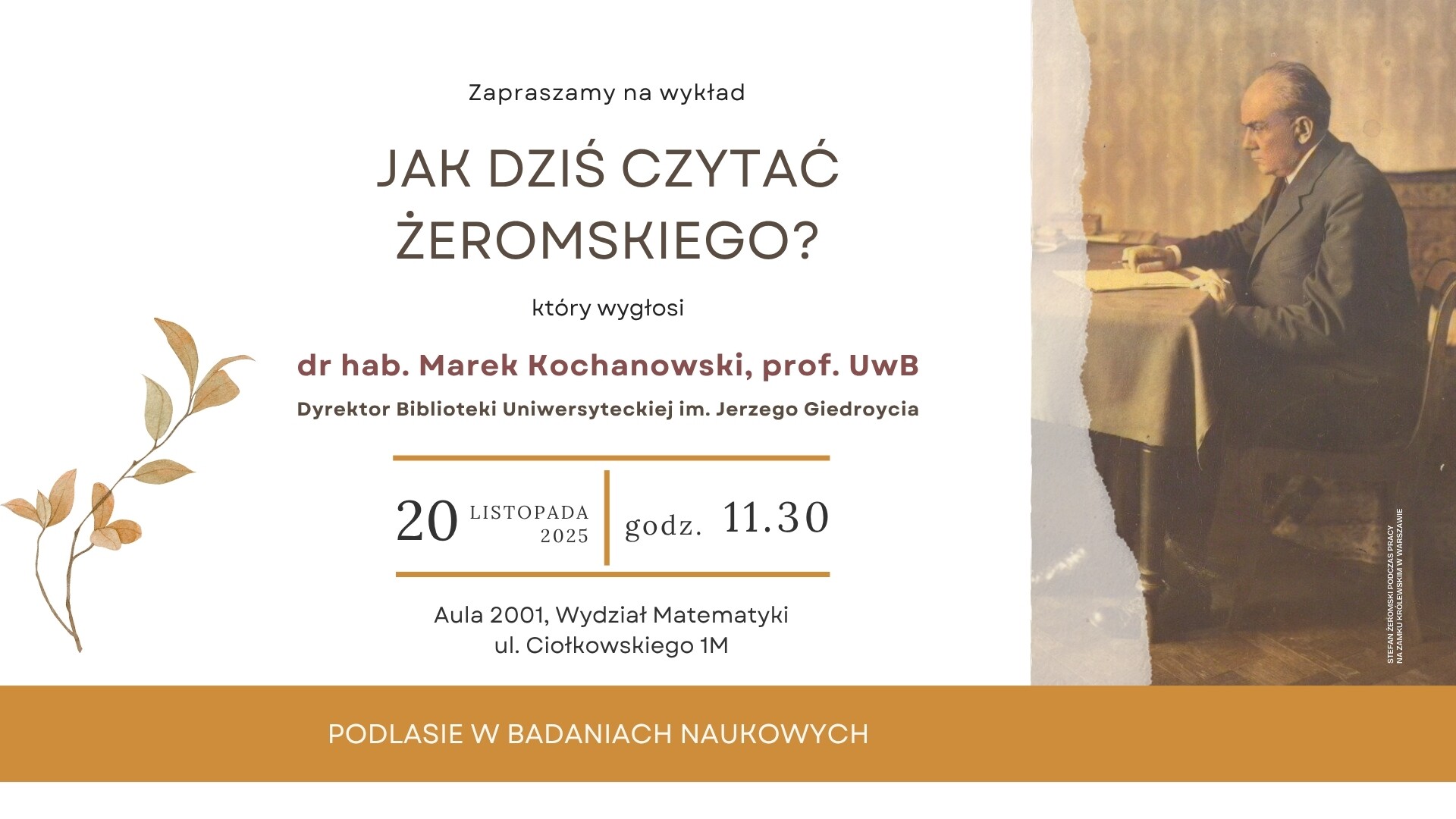 Przed nami kolejne spotkanie w ramach cyklu Podlasie w badaniach naukowych. Tym razem wykład pt. „Jak dziś czytać Żeromskiego?” wygłosi dr hab. Marek Kochanowski, prof. UwB, dyrektor Biblioteki Uniwersyteckiej im. Jerzego Giedroycia. Wydarzenie odbędzie się 20 listopada br., godz. 11:30 w auli 2001 na Wydziałach Matematyki i Informatyki (ul. K. Ciołkowskiego 1M). Wstęp wolny.