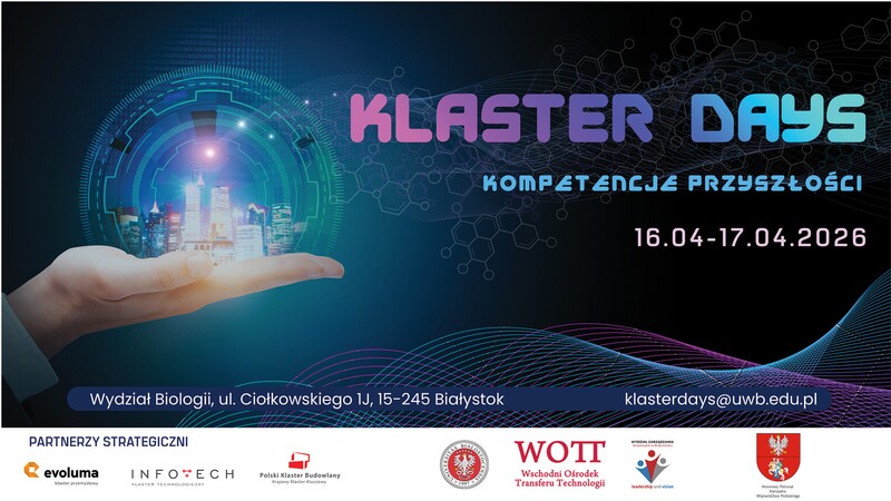 W dniach 16–17 kwietnia 2026 roku kampus Uniwersytetu w Białymstoku stanie się areną kluczowych spotkań świata akademickiego z nowoczesnym biznesem. W murach Wydziału Biologii odbędzie się wydarzenie Klaster Days "Kompetencje Przyszłości", na które serdecznie zapraszamy całą społeczność naszej uczelni – zarówno kadrę naukową i dydaktyczną, jak i studentów wszystkich kierunków.