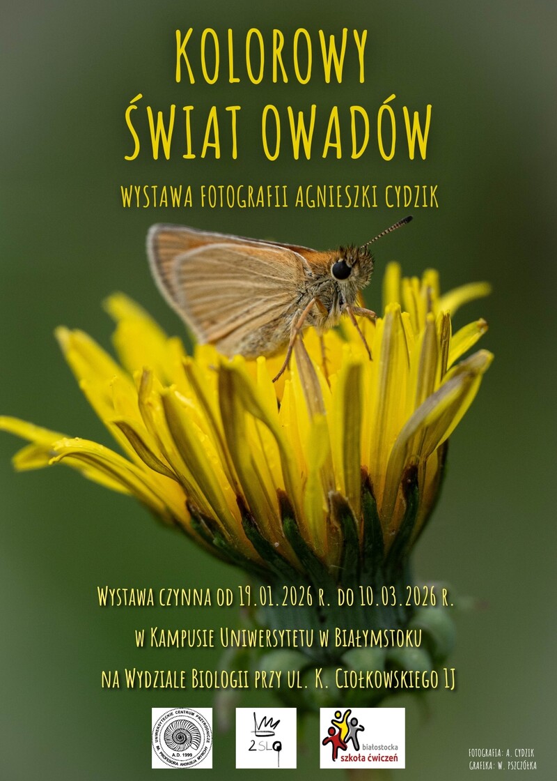 Uniwersyteckie Centrum Przyrodnicze zaprasza do obejrzenia wystawy fotograficznej Agnieszki Cydzik pt. Kolorowy świat owadów, która prezentowana jest w kampusie Uniwersytetu w Białymstoku, w holu głównym Wydziału Biologii przy ul. Ciołkowskiego (na parterze). Ekspozycja będzie prezentowana od 19 stycznia do 10 marca 2026 roku.