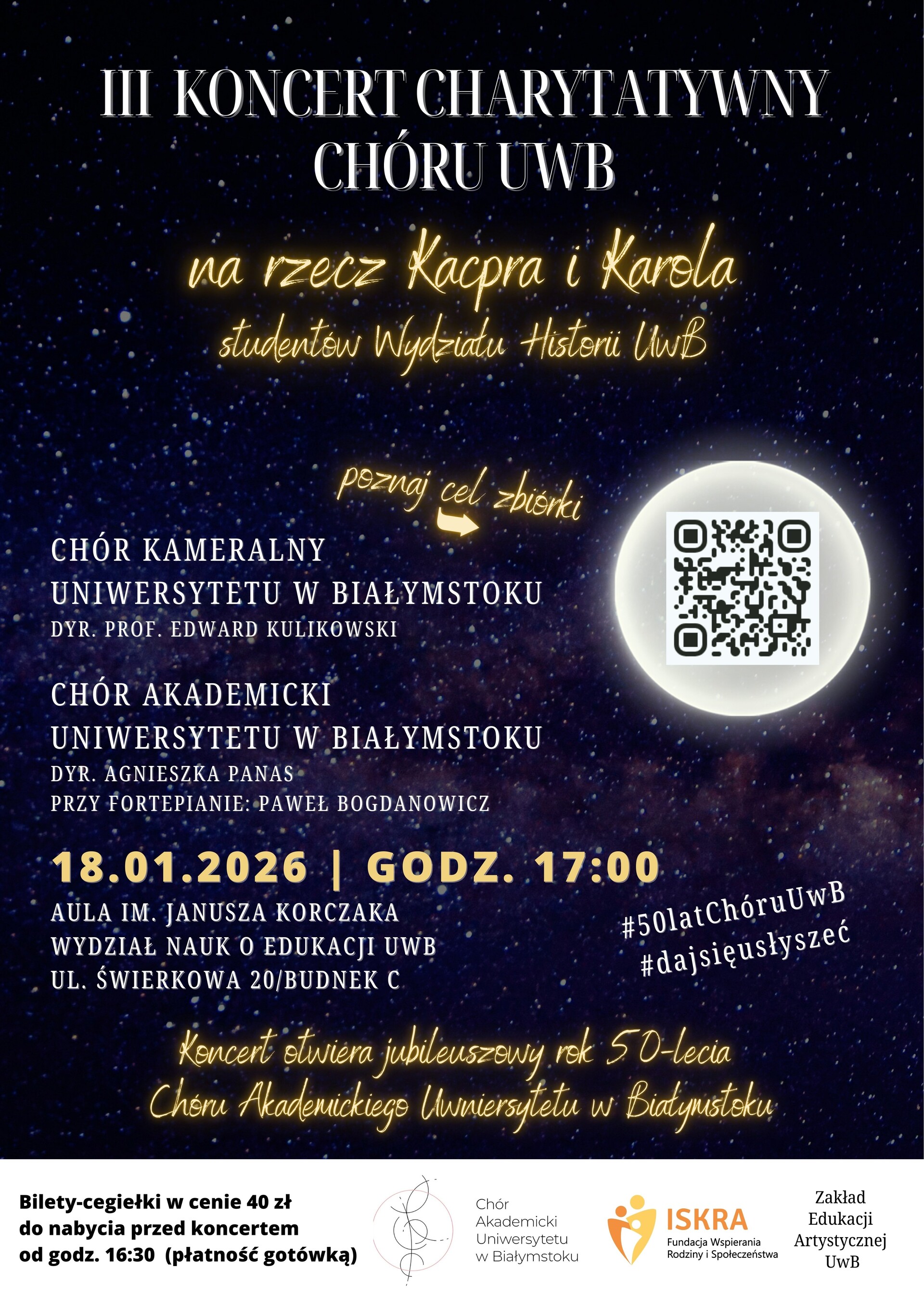 Już po raz trzeci Chór Akademicki UwB łączy się ze społecznością Uniwersytetu w Białymstoku i przyjaciółmi chóru, by wspólnie działać w szczytnym celu - okazać wsparcie osobom potrzebującym, związanym z Uniwersytetem w Białymstoku. Dlatego serdecznie zaprasza na koncert charytatywny, który odbędzie się 18 stycznia br. (niedziela), o godz. 17.00 w Auli im. Janusza Korczaka Wydziału Nauk o Edukacji, przy ul. Świerkowej 20.