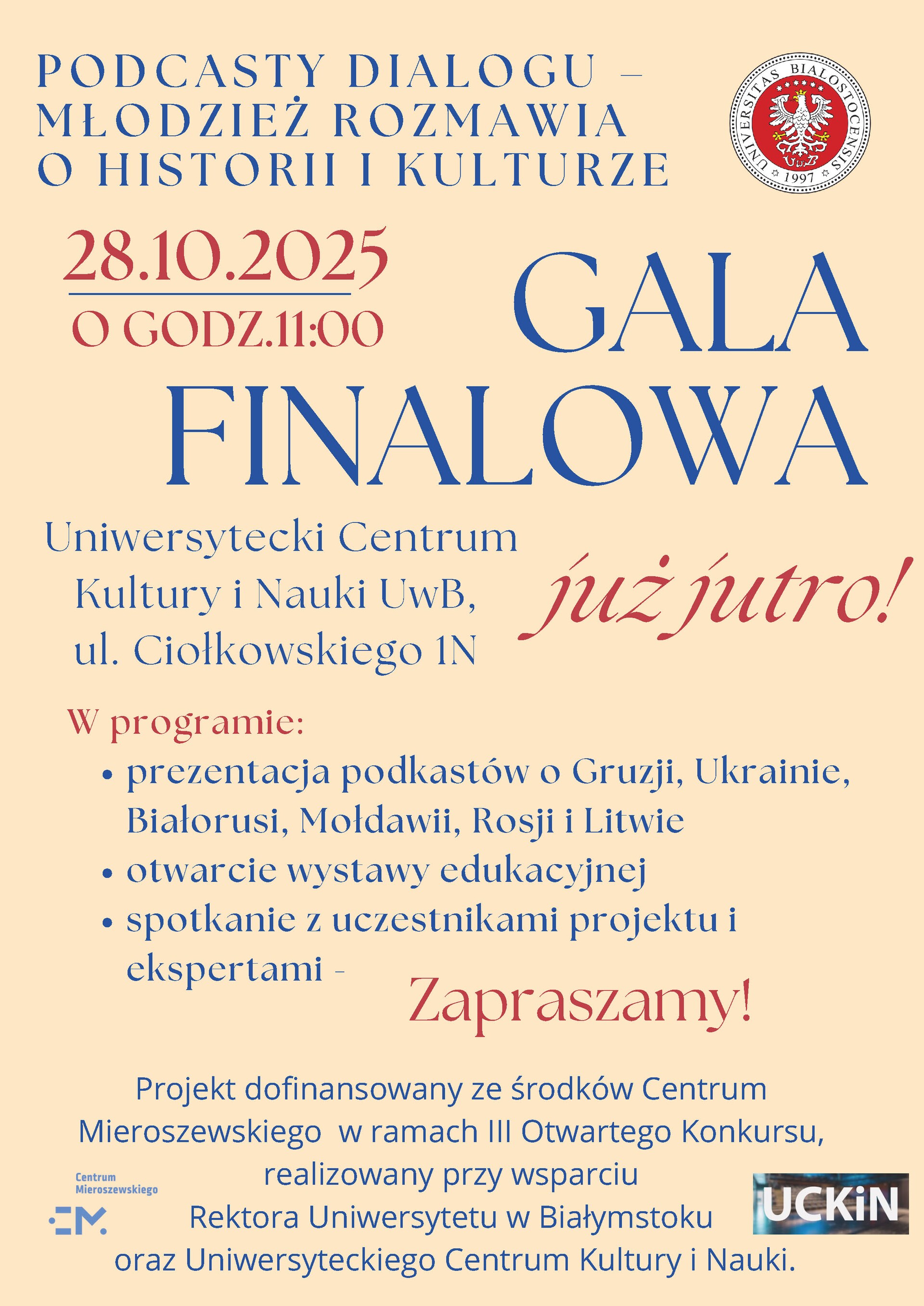We wtorek, 28 października 2025 r., w Uniwersyteckim Centrum Kultury i Nauki przy ul. Ciołkowskiego odbędzie się gala finałowa projektu „Podcasty Dialogu – Młodzież rozmawia o historii i kulturze”, podczas której zaprezentowane zostaną efekty pracy młodzieży i ekspertów – edukacyjne podcasty o kulturze, tradycjach i tożsamości narodów Europy Wschodniej: Ukrainy, Białorusi, Mołdawii, Gruzji i Rosji. Wydarzenie rozpocznie się o godz. 11.00, a jego organizatorzy zapraszają wszystkich zainteresowanych.