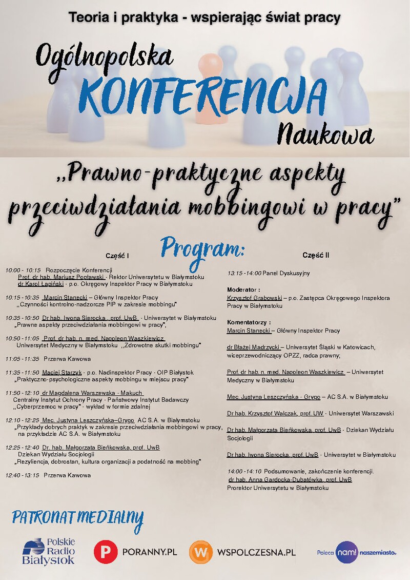 Uniwersytet w Białymstoku wraz z Okręgowym Inspektoratem Pracy w Białymstoku współorganizują konferencję poświęconą jednemu z najpoważniejszych wyzwań współczesnego rynku pracy – zjawisku mobbingu. Odbędzie się ona 21 października 2025 r. w siedzibie Wydziałów Matematyki i Informatyki UwB (kampus, ul. Ciołkowskiego). początek o godz. 10.