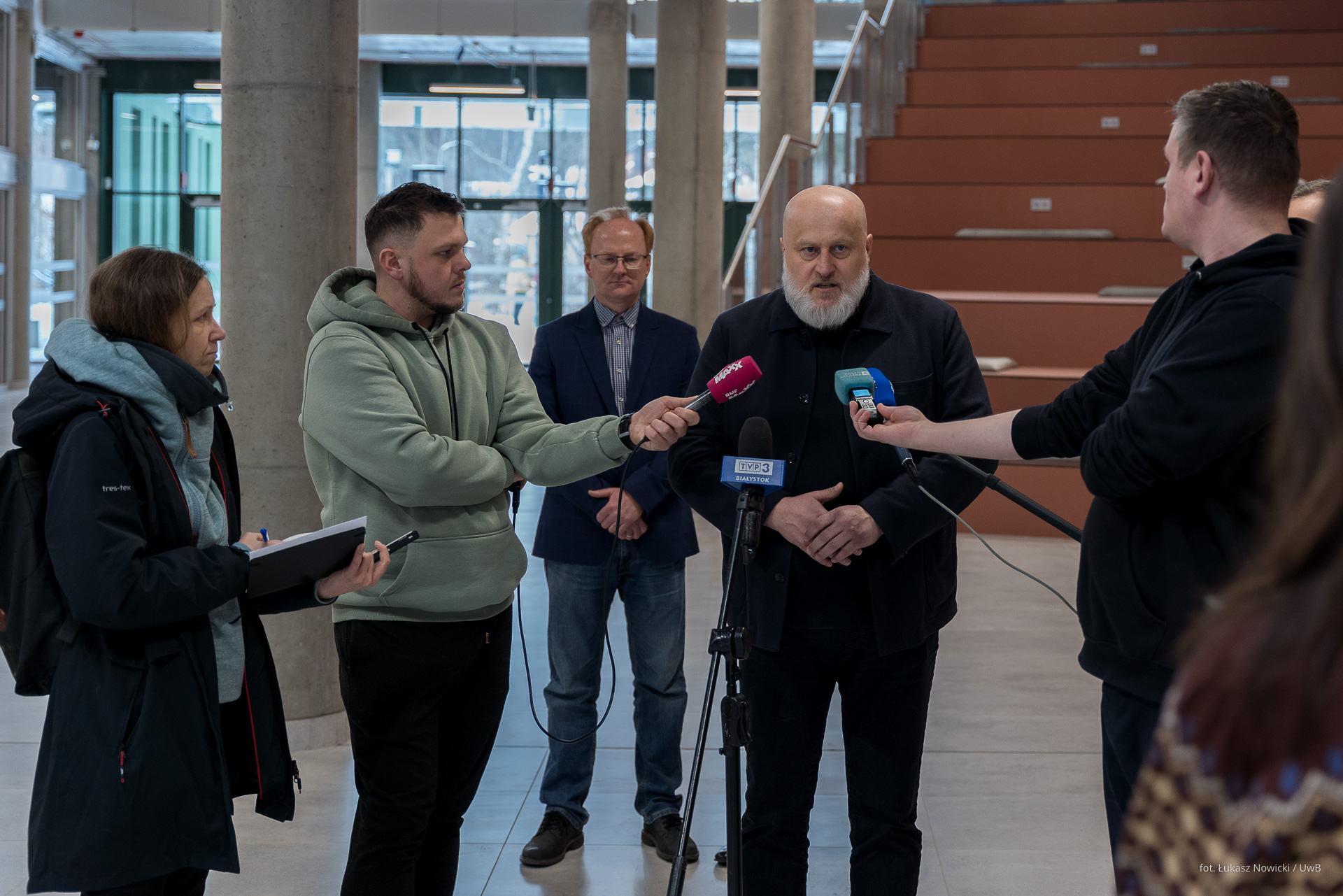 budynek nauk humanistycznych UwB - Kanclerz Tomasz Zalewski mówi do mediów